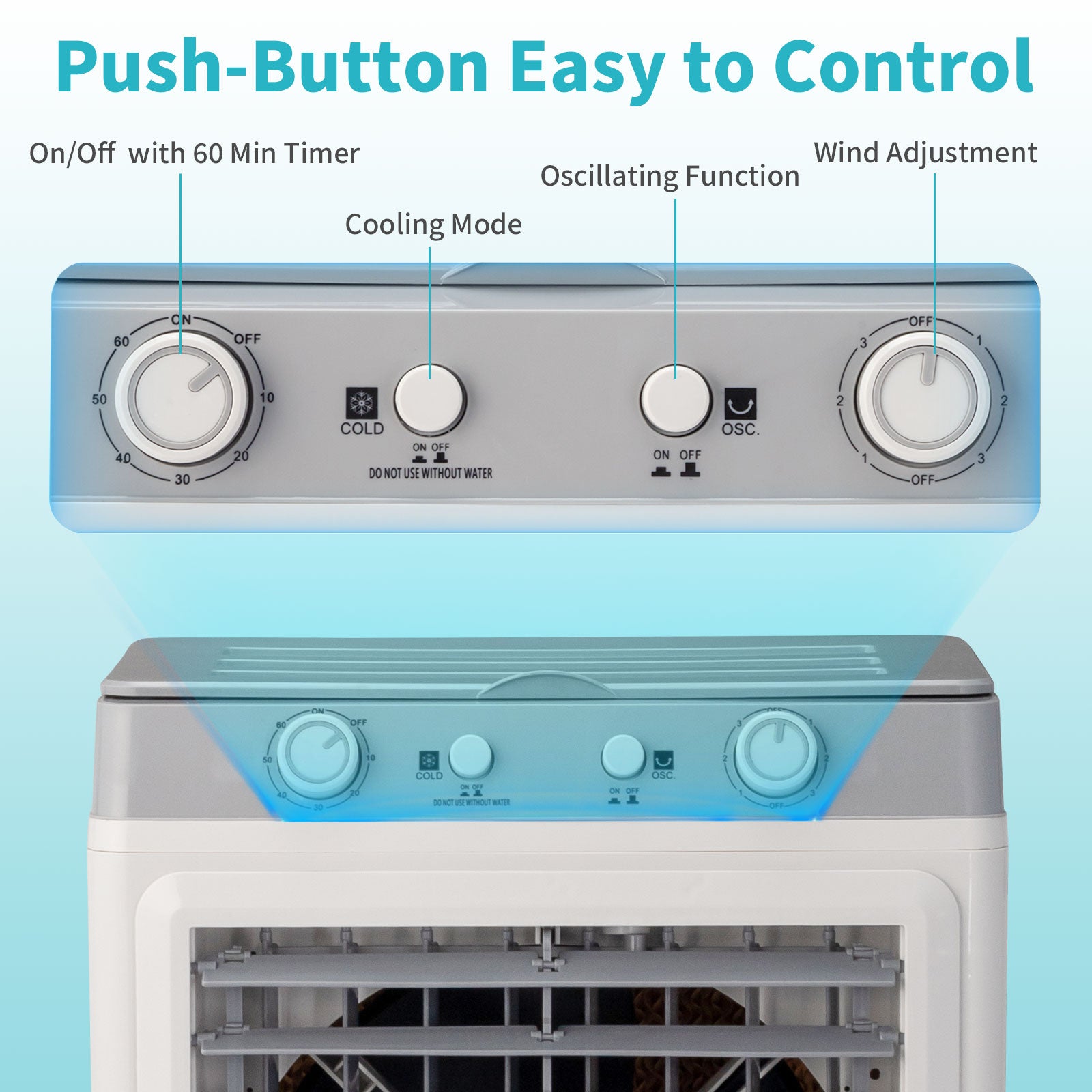 3 in 1 Portable Evaporative Cooler,Indoor,Outdoor,2353CFM Personal Air Cooler,7.9 Gal Large Water Tank & Scroll Casters, 4 Ice Packs,White,Manual control