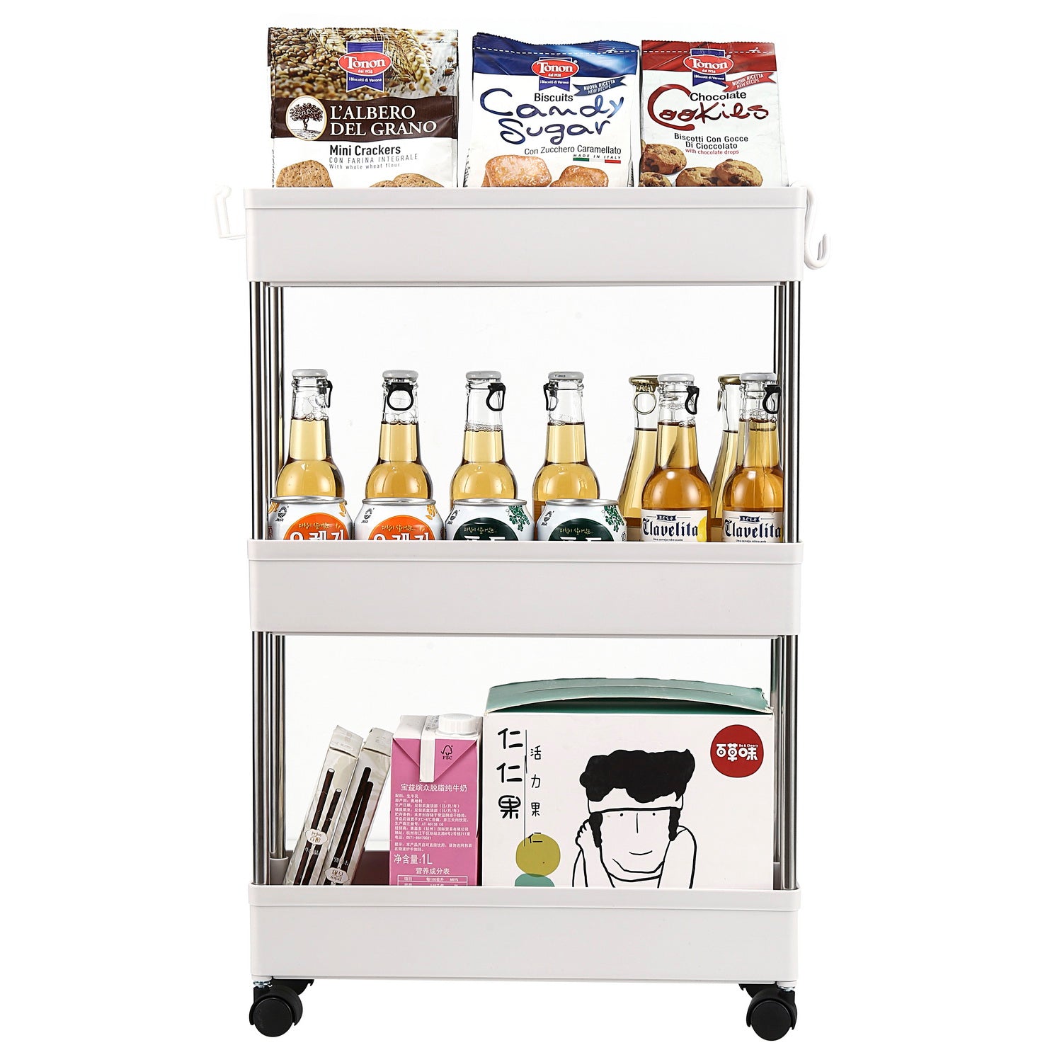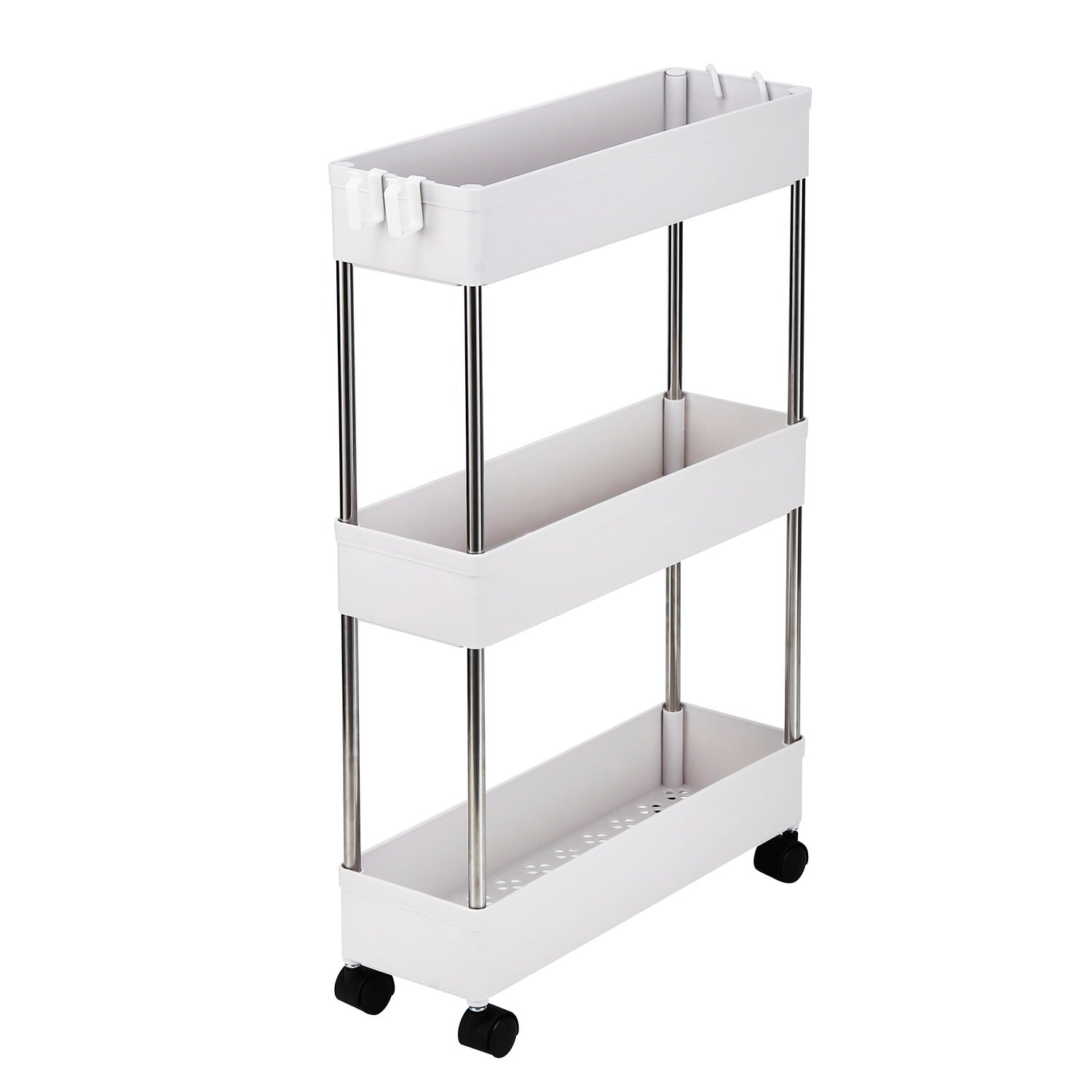 3-Layer Ultra-thin, Mobile Multi-Functional Slim Storage Cart,Suitable for Kitchen, Bathroom, Laundry Room Narrow Place, Plastic and Stainless Steel, White