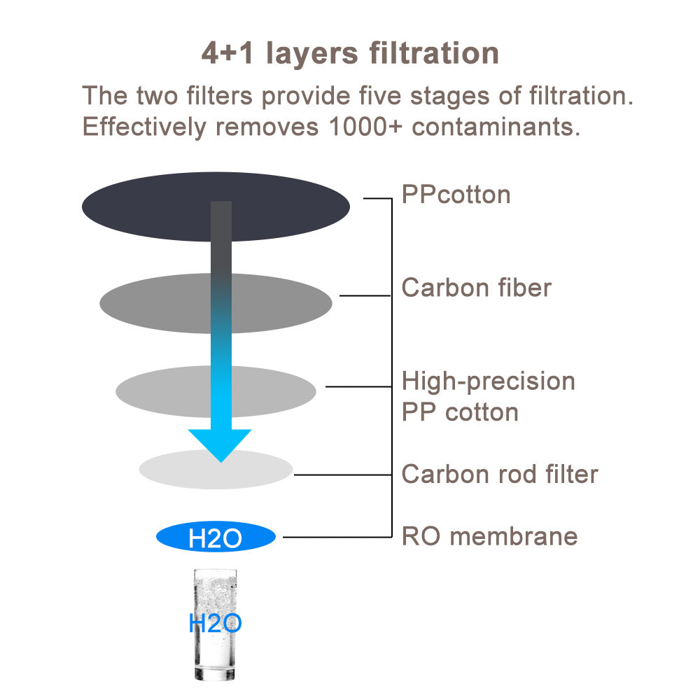 suspended solids, taste, odor and other impurities, providing you with clean and pure water.The RO membrane with precision at 0.0001μm, it can effectively remove heavy metals, TDS, bacteria, and other harmful microorganisms.