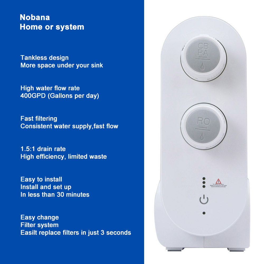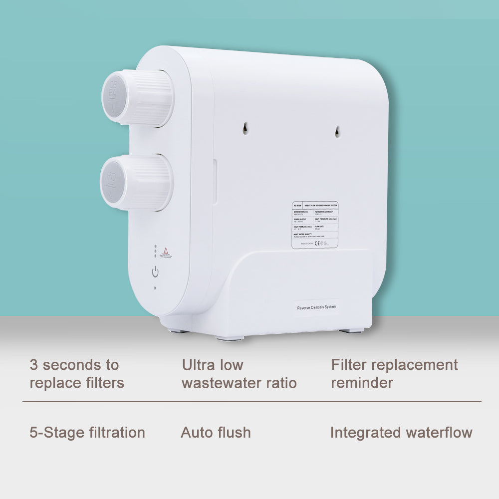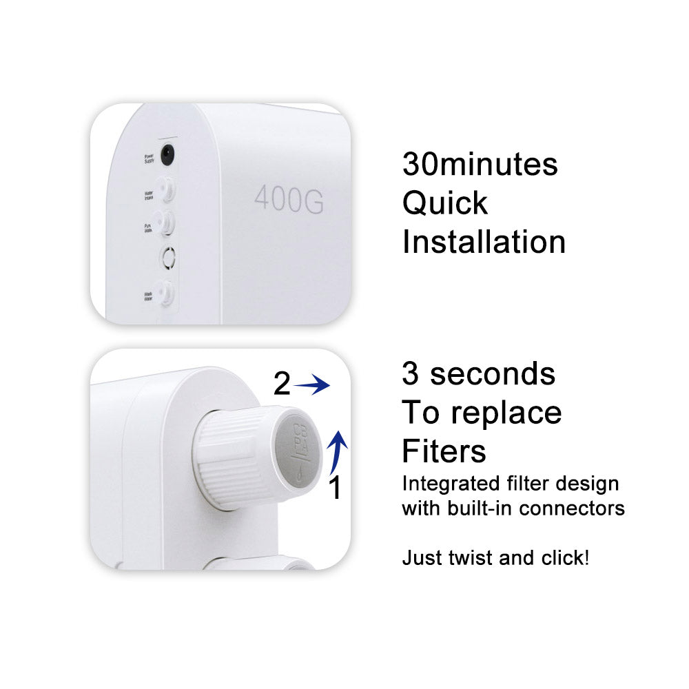 1.No tank structural design saves over 70% more under-sink storage space than the ordinary RO system.The advanced integrated design of the electrical and water circuits reduces leakage,and easy to Installation only three pipes need to be inserted correctly to connect the RO water filter.
