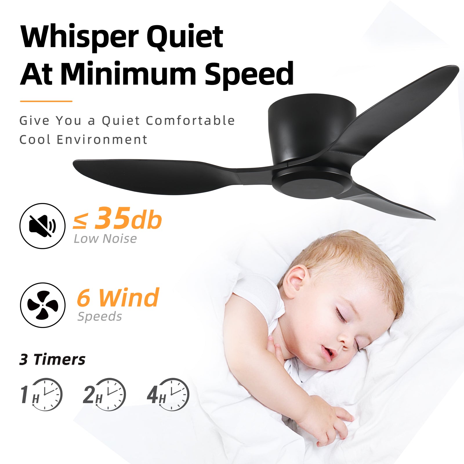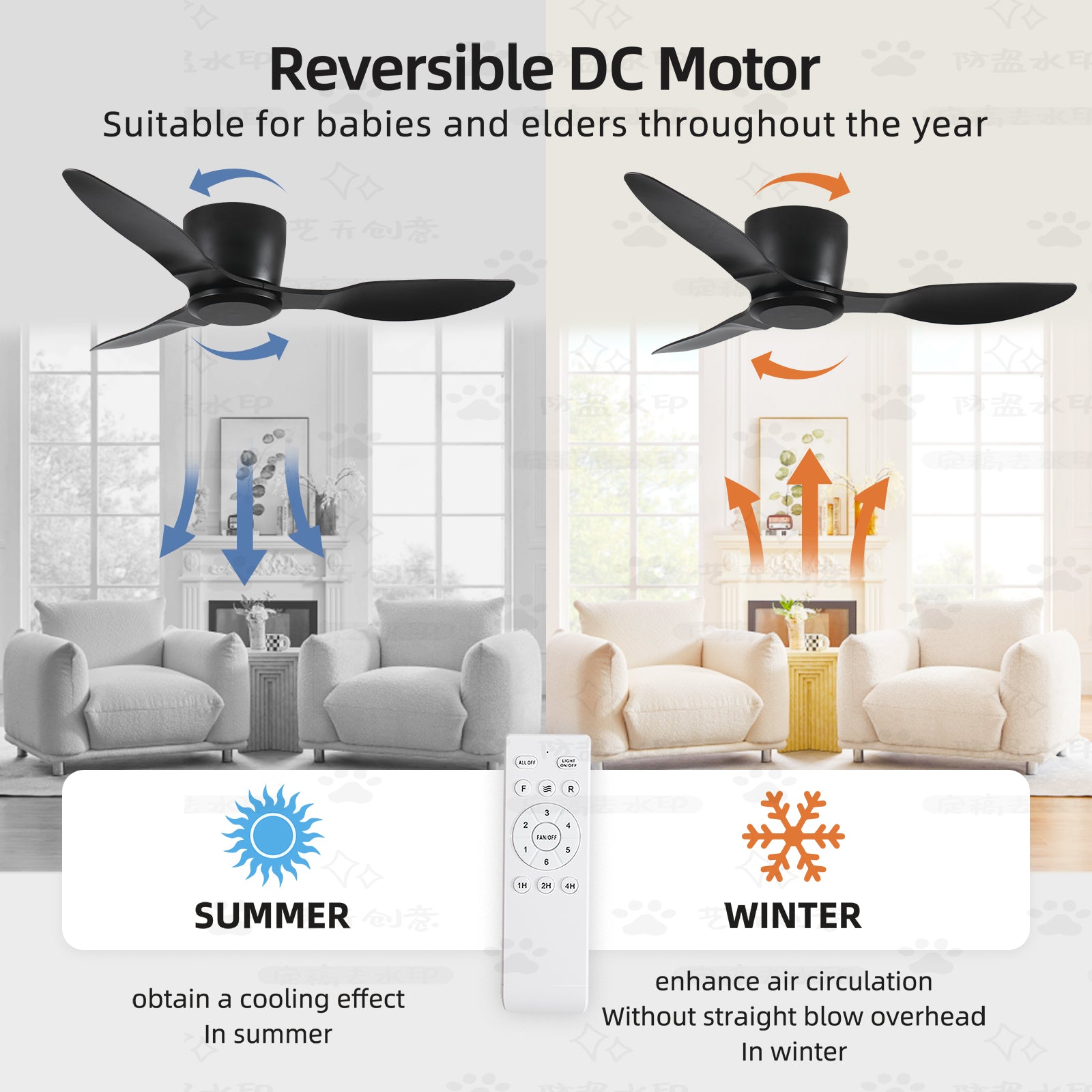 - 【Quiet & Reversible Ceiling Fan 】The low profile ceiling fan features a reverse airflow function, allowing you to easily change the rotation of the fan for a cooling effect during the summer months and improved air circulation. The fan motor is equipped with a pure copper motor that boasts low noise performance, emitting less than 35 dB of noise. This not only makes it more energy-efficient, but also ensures that it won't disrupt your sleep or study.