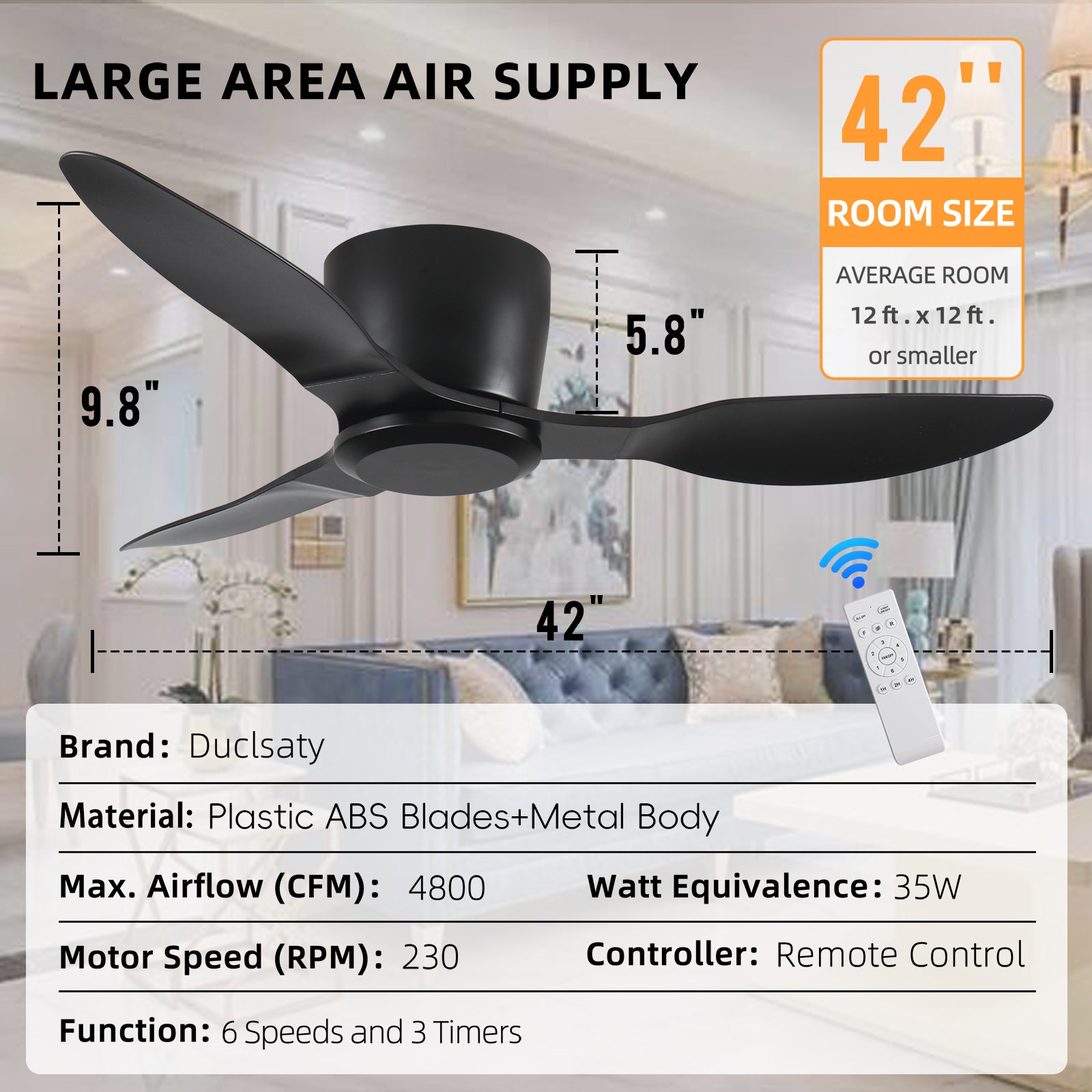 - 【Multi-Speed & 3 Timers】Duclsaty indoor and outdoor ceiling fan with remote control for easy adjustment of 6 wind speeds,timer function with 1H/2H/4H sleep time,allowing you to set it to automatically turn off at your desired intervals. This modern ceiling fan also has a reversible function.