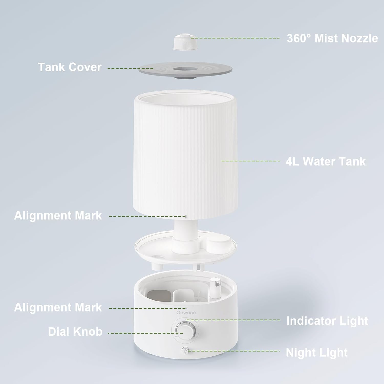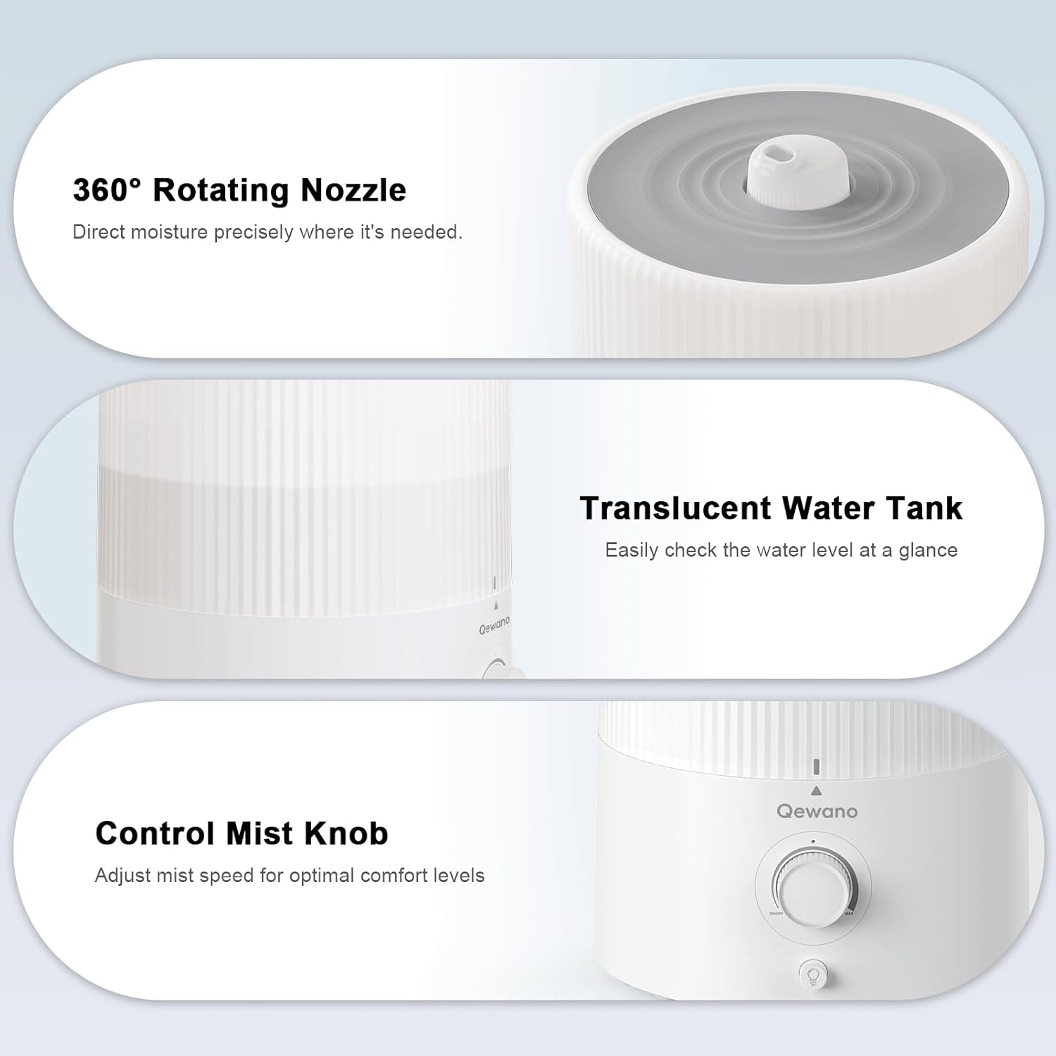 - 【Safe and Easy to Use】: Room humidifiers for bedroom have a singular knob and 360°rotating nozzle that allows for simple adjustments to the mist's direction and output. Achieving ideal air moisture is effortless, which can enhance the air you breathe. A safety feature automatically shuts off the humidifier when water levels are low, eliminating risks and damage.