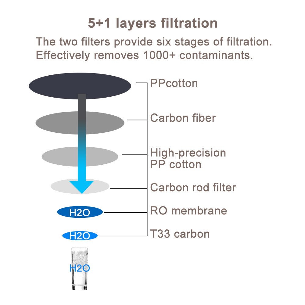 suspended solids, taste, odor and other impurities, providing you with clean and pure water.The RO membrane with precision at 0.0001μm, it can effectively remove heavy metals, TDS, bacteria, and other harmful microorganisms.