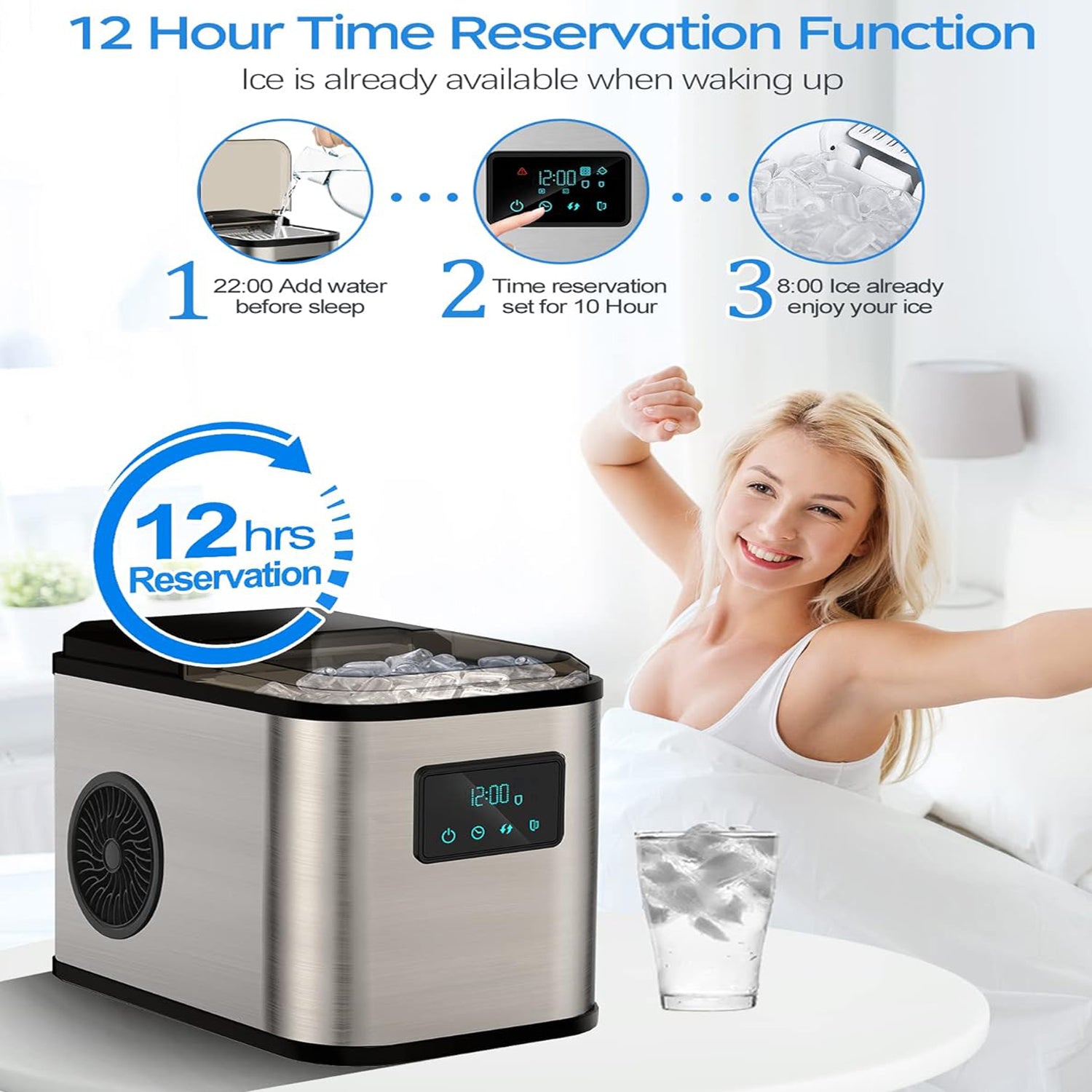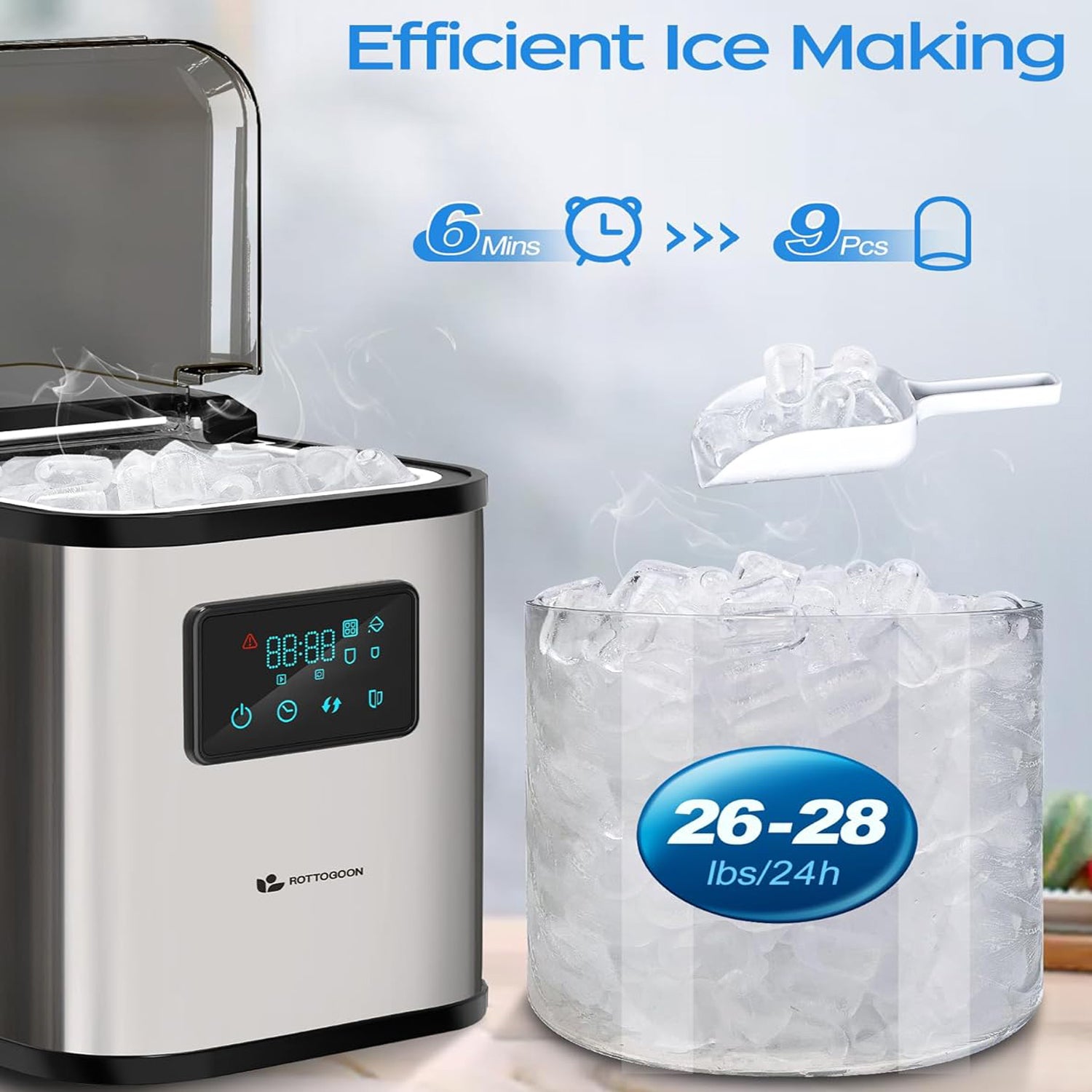 Ice Maker Countertop, Portable Ice Maker Machine, 28lbs/24Hrs, 6 Mins/9 Pcs Bullet Ice, Mini Ice Maker with Self Cleaning, Time Reservation Function, LED Display, Include Scoop & Basket, Stainless