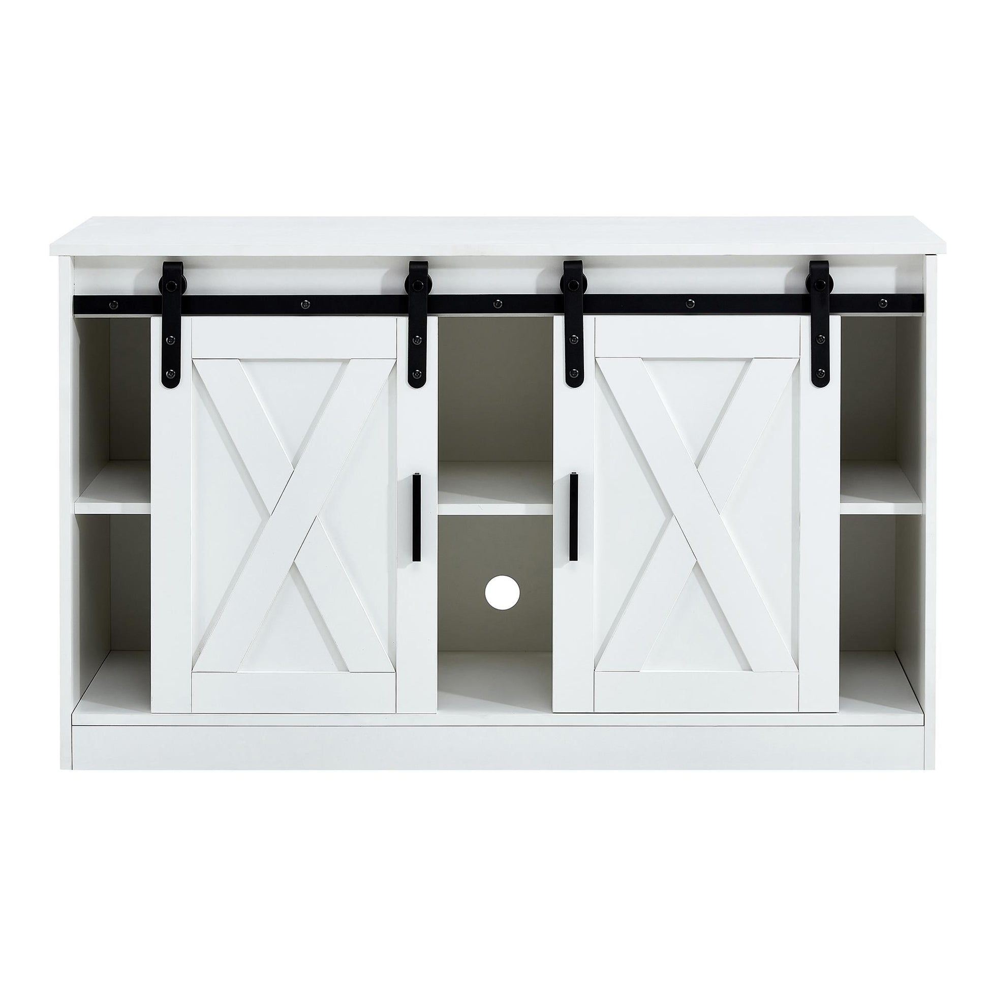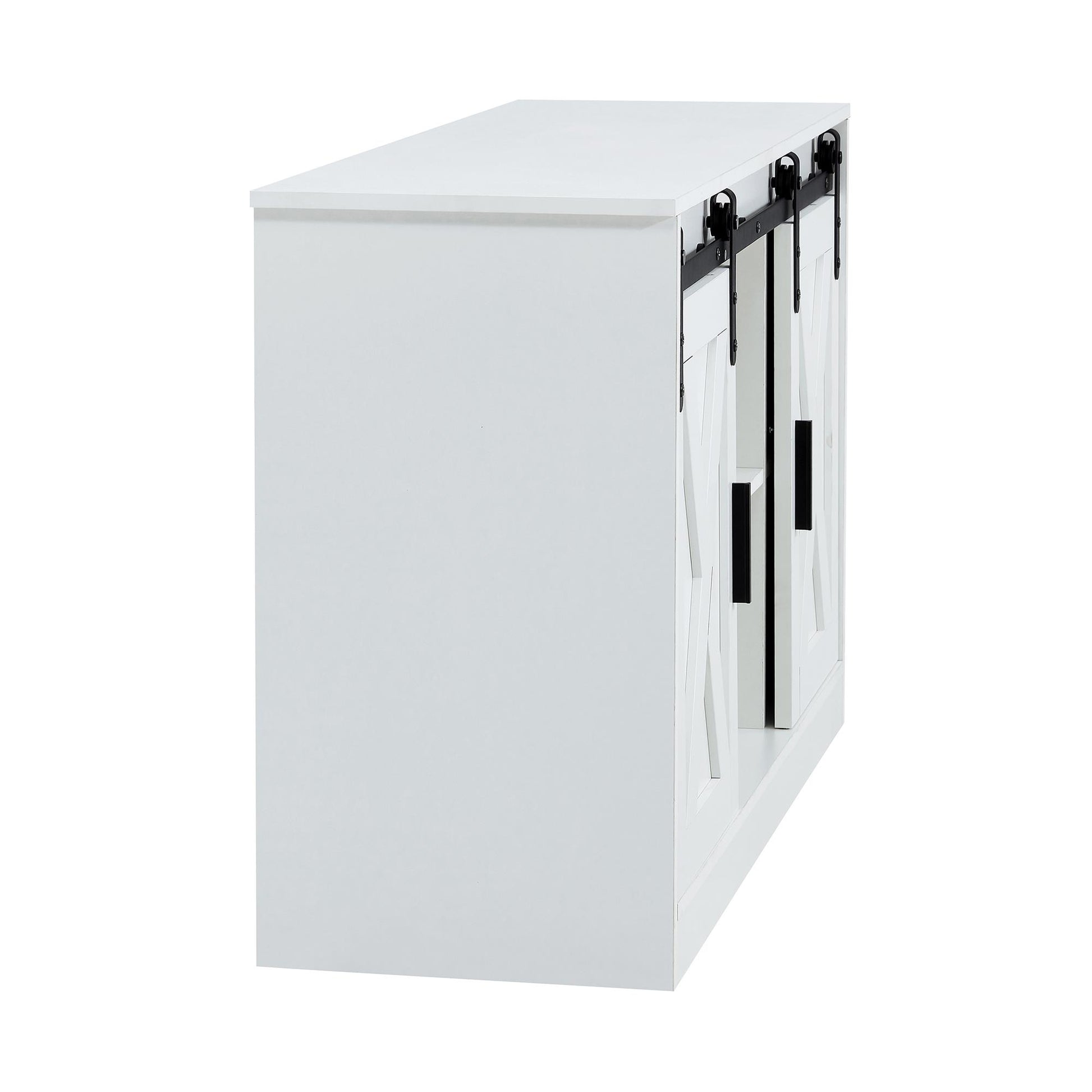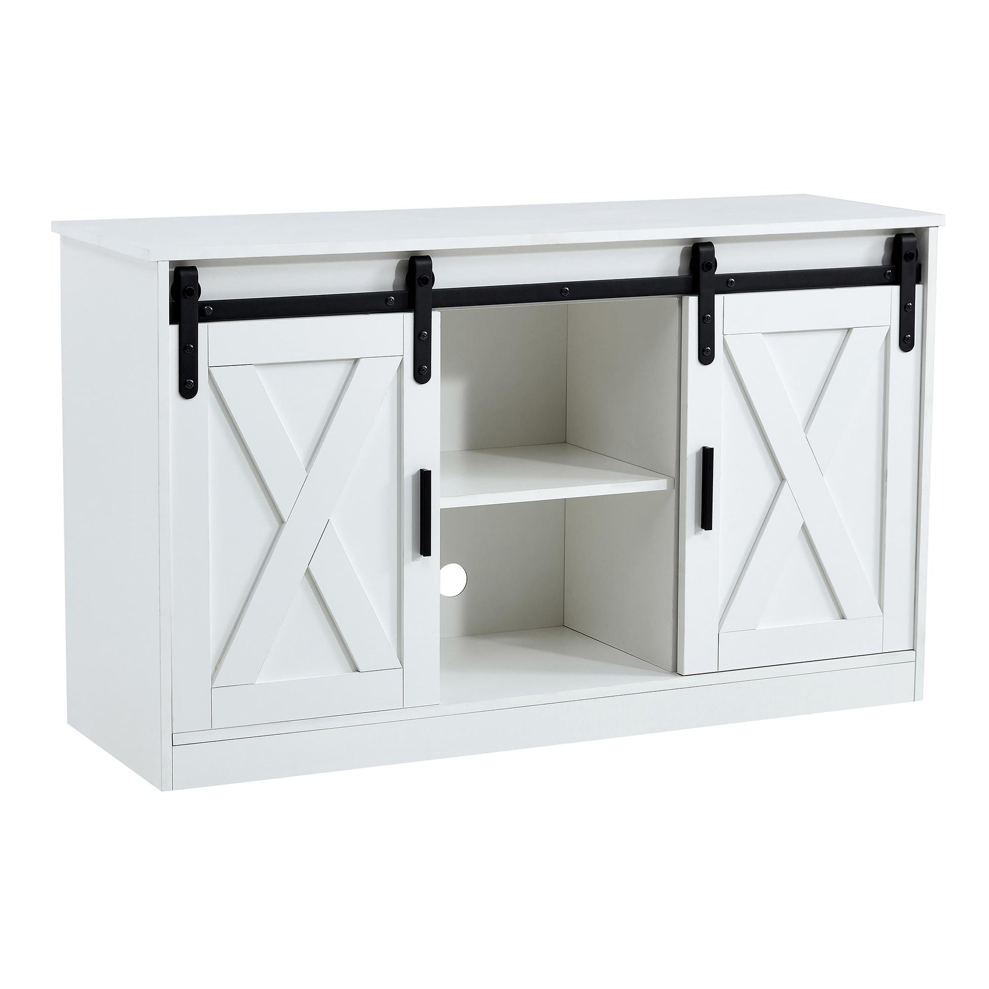 White decorative wooden TV / storage cabinet with two sliding barn doors, available for bedroom, living room, corridor.