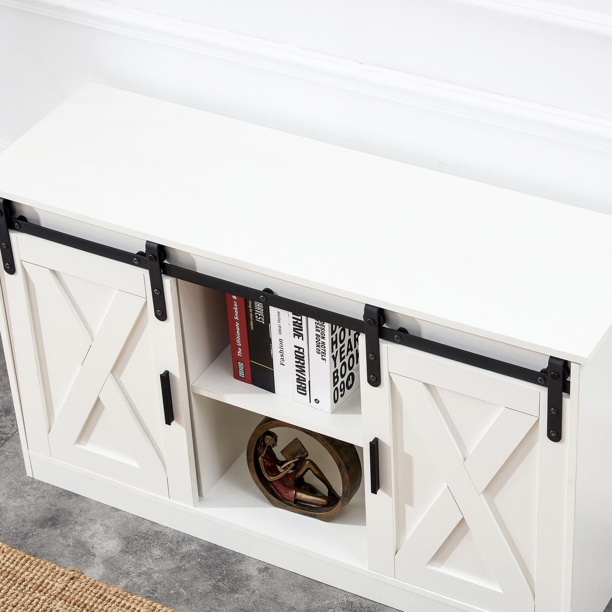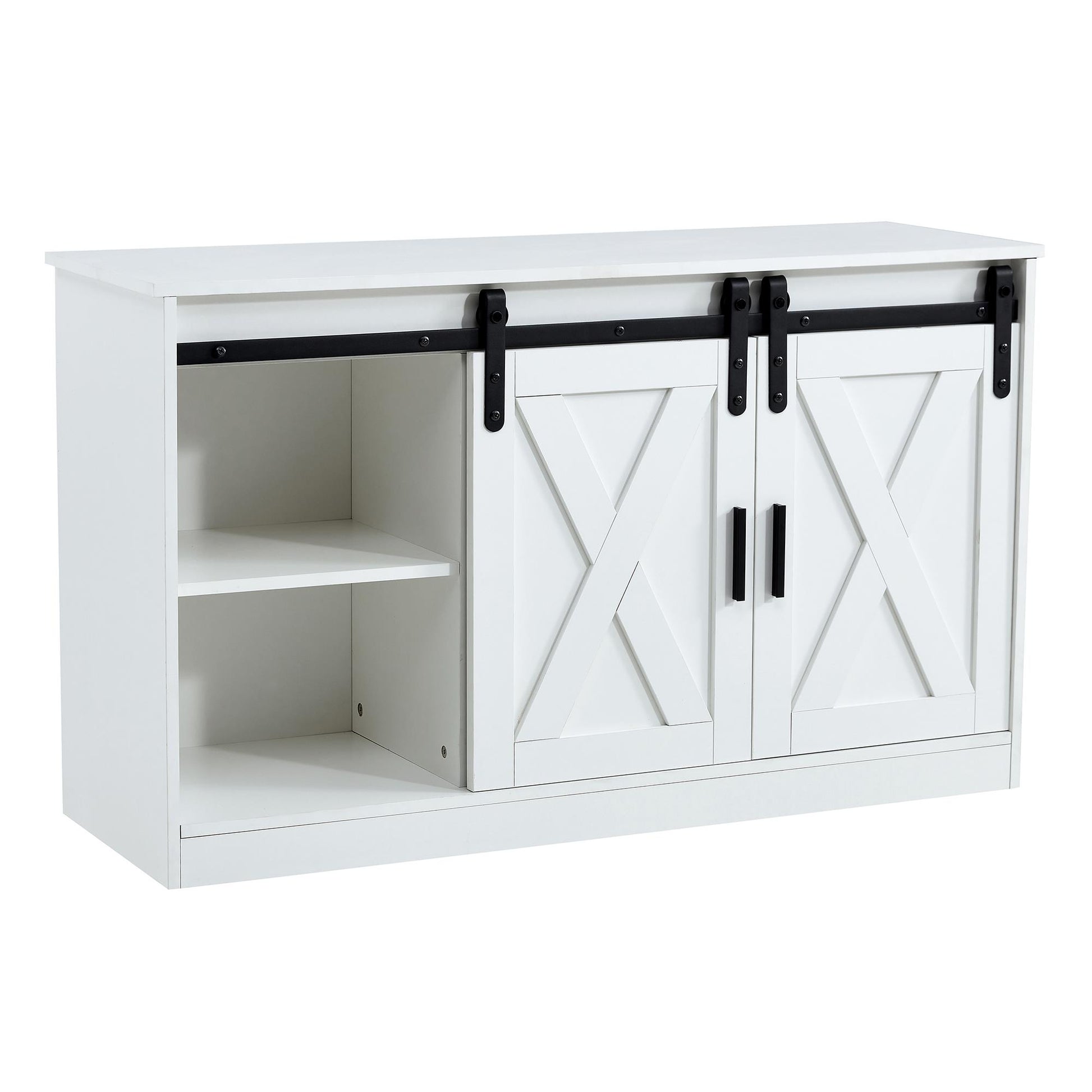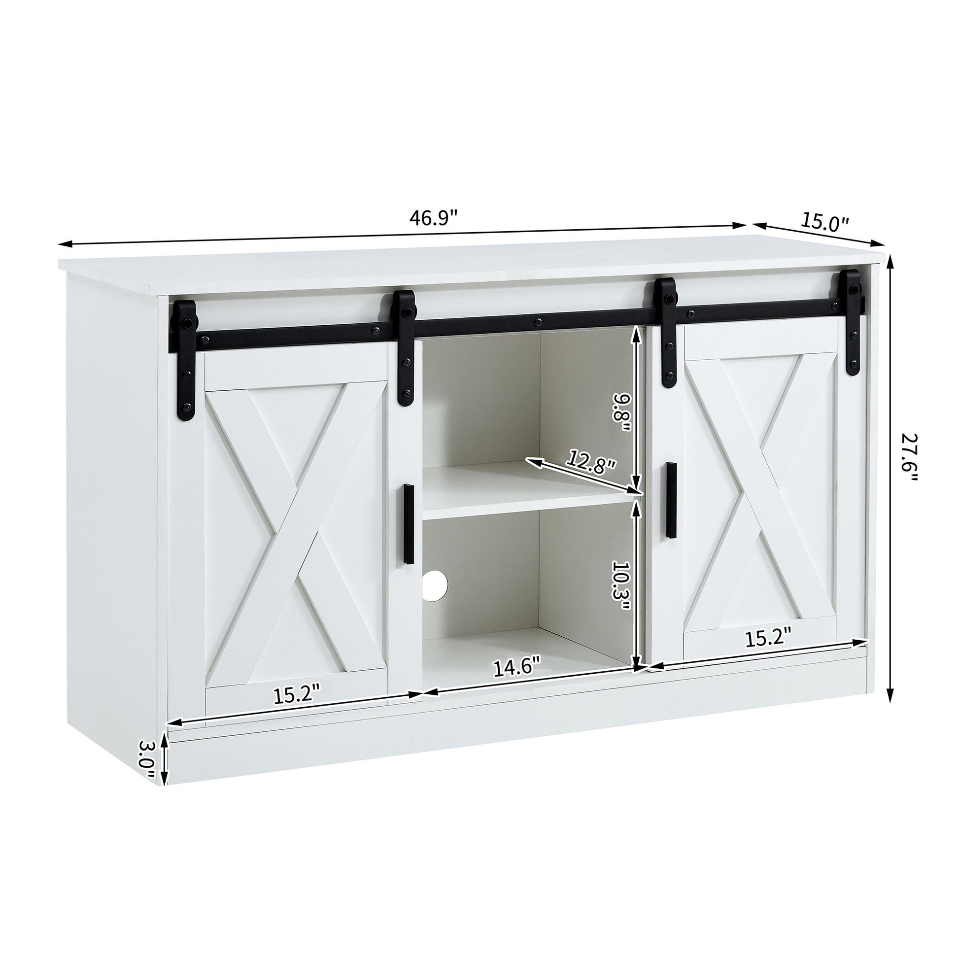 White decorative wooden TV / storage cabinet with two sliding barn doors, available for bedroom, living room, corridor.